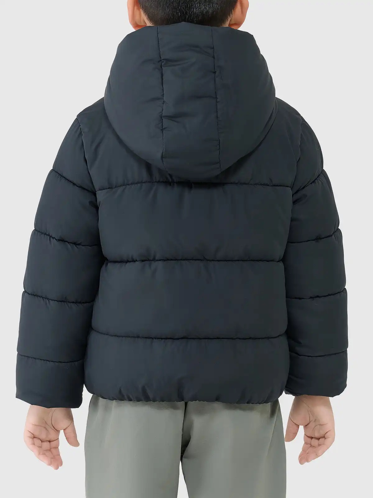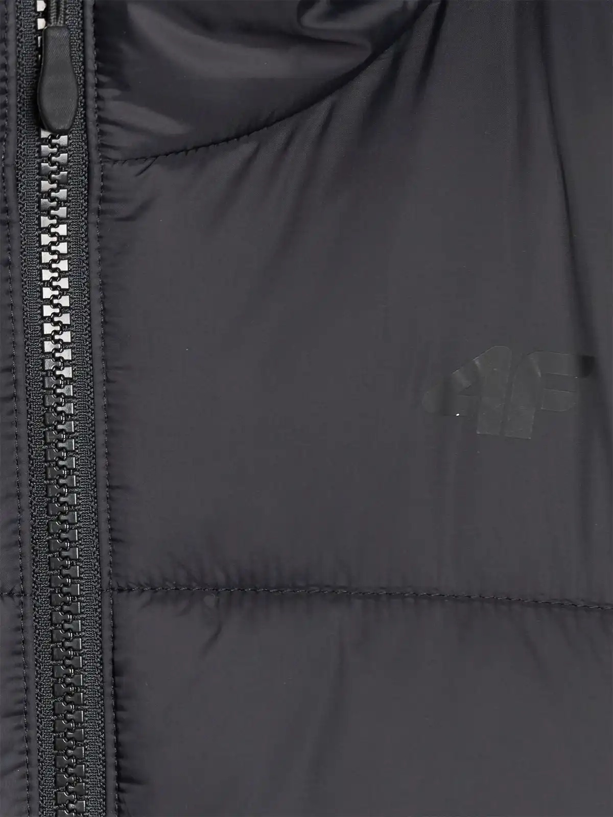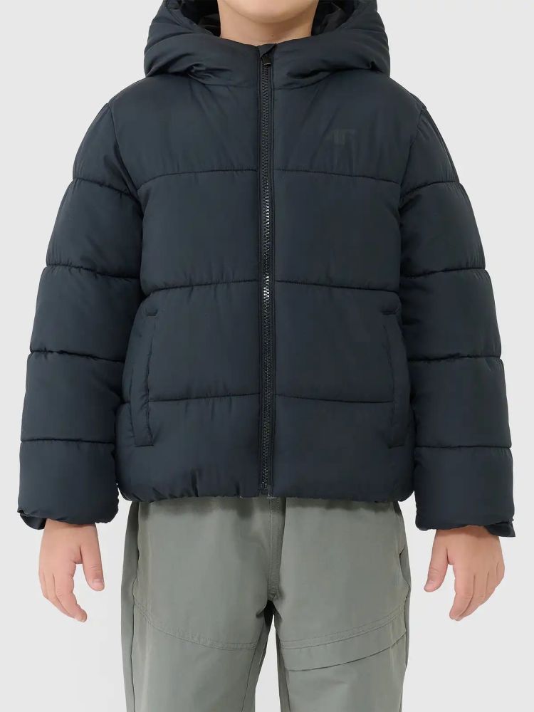 The boys' down jacket with a hood, with an optimal filling weight, can be worn daily and during sports activities on colder days. Its moderate bulk provides sufficient insulation from the cold without adding bulk. It will perform well in various weather conditions, providing not only thermal comfort, but also complete freedom of movement. The jacket features classic horizontal quilting consisting of parallel stripes running across the jacket. This type of quilting ensures good thermal insulation and adequate compressibility of the jacket. It is characterized by a regular shape that easily adapts to the figure and a standard length to the hips. Boys' down jacket 4F with synthetic down that is more durable and easier to care for than natural down. Even when exposed to moisture, it retains its insulating properties for a longer time and dries much faster. In addition, it does not require a complicated washing and drying process.