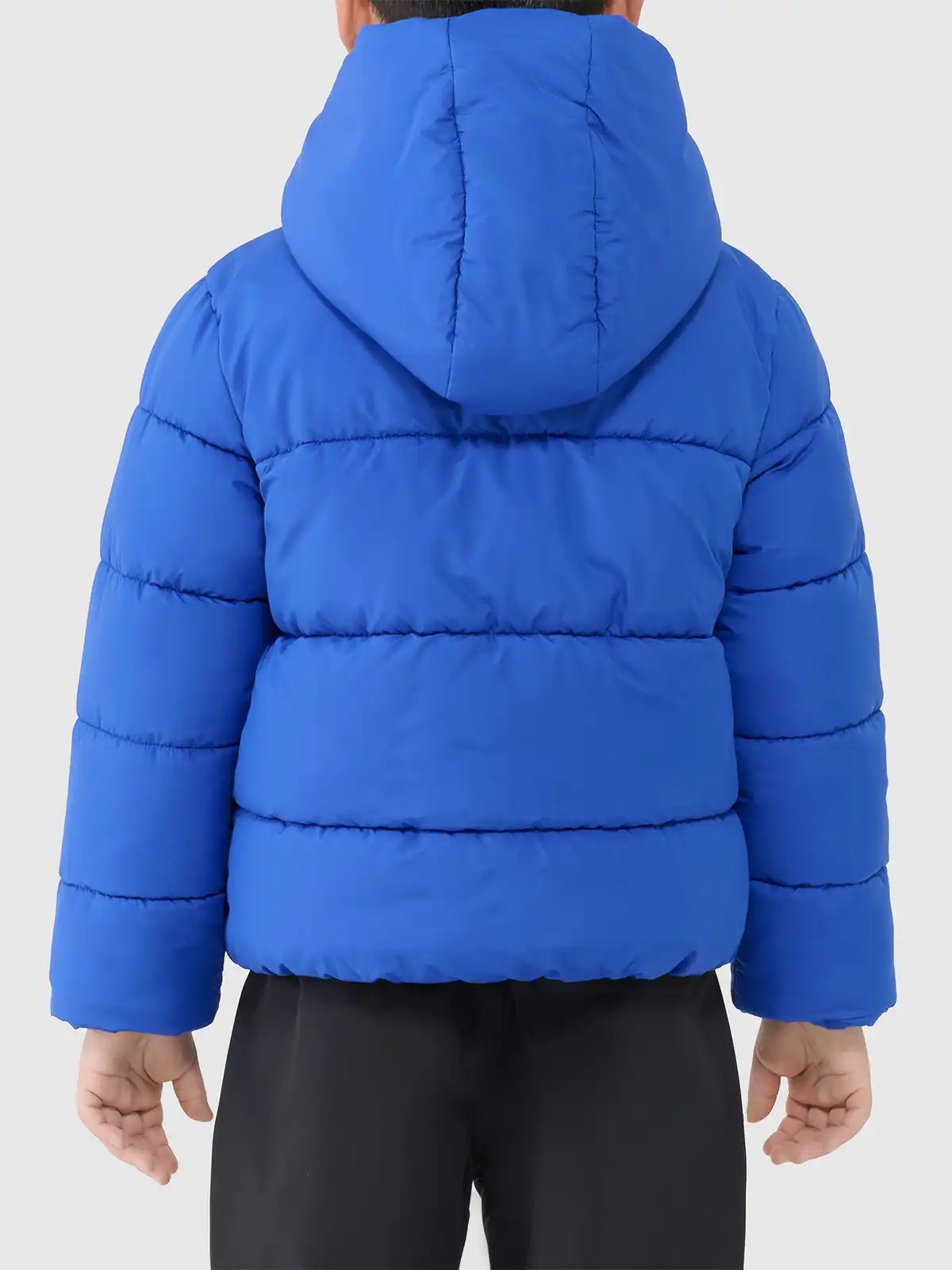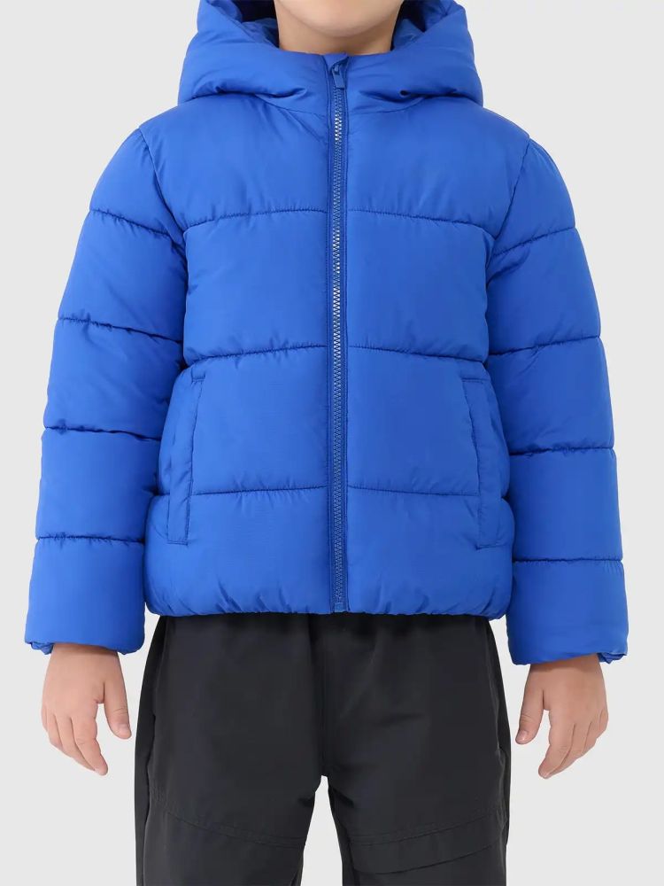 The boys' down jacket with a hood, with an optimal filling weight, can be worn daily and during sports activities on colder days. Its moderate bulk provides sufficient insulation from the cold without adding bulk. It will perform well in various weather conditions, providing not only thermal comfort, but also complete freedom of movement. The jacket features classic horizontal quilting consisting of parallel stripes running across the jacket. This type of quilting ensures good thermal insulation and adequate compressibility of the jacket. It is characterized by a regular shape that easily adapts to the figure and a standard length to the hips. Boys' down jacket 4F with synthetic down that is more durable and easier to care for than natural down. Even when exposed to moisture, it retains its insulating properties for a longer time and dries much faster. In addition, it does not require a complicated washing and drying process.