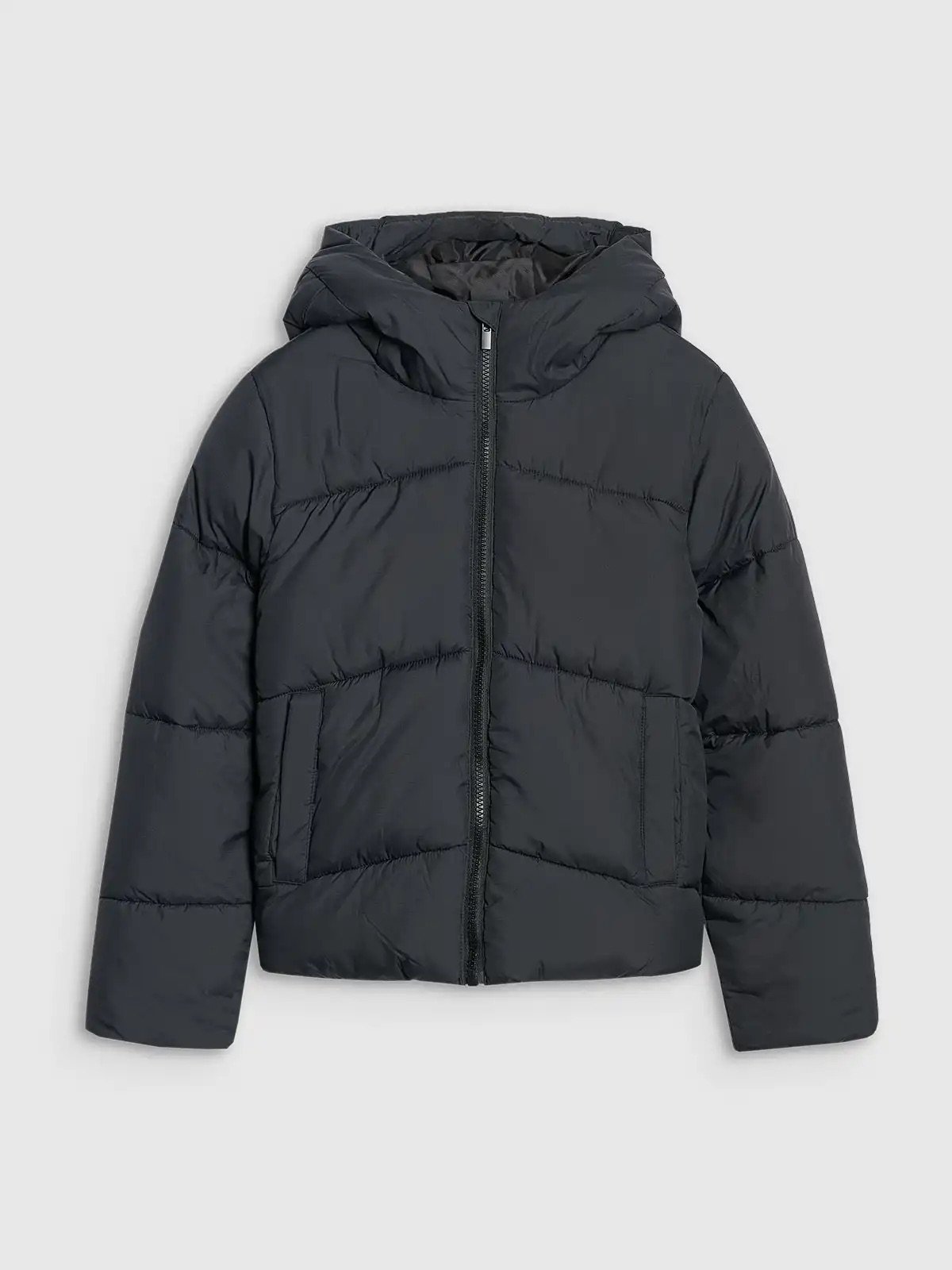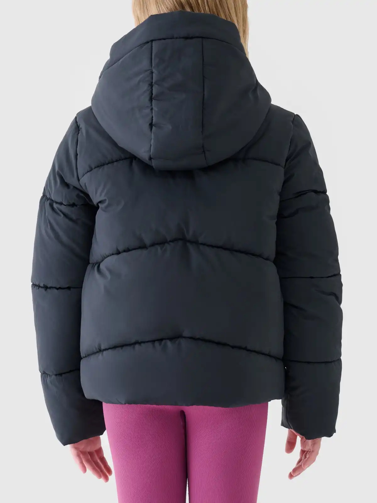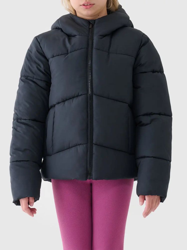 It has a regular cut that comfortably fits the figure and a standard length reaching to the hip line. Girls' quilted down jacket with a filling in the form of recycled synthetic down. Girls' 4F down jacket The filling in the form of synthetic down is more durable and easier to maintain than natural down. Even when in contact with moisture, it retains its insulating properties for a longer period of time and dries much faster. Additionally, it does not require a complicated washing and drying process.