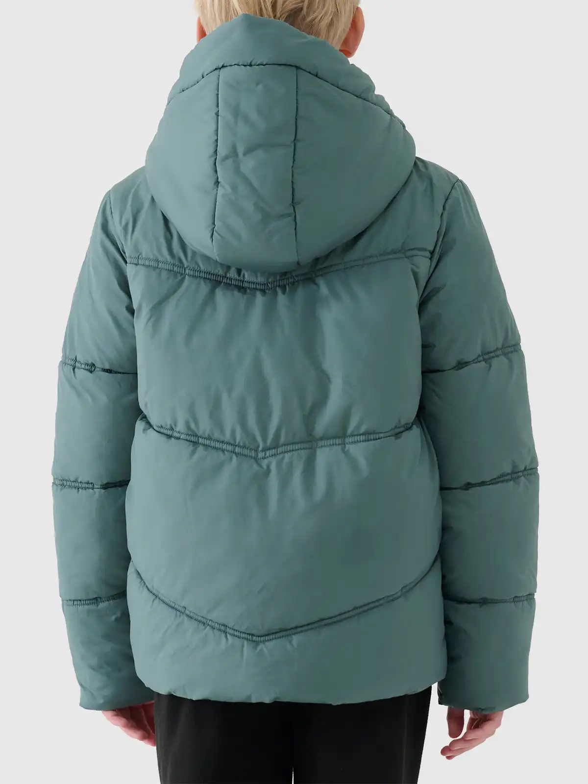 The boys' down jacket with a hood, with an optimal filling weight, can be worn daily and during sports activities on colder days. Its moderate bulk provides sufficient insulation from the cold without adding bulk. It will perform well in various weather conditions, providing not only thermal comfort, but also complete freedom of movement. The jacket features classic horizontal quilting consisting of parallel stripes running across the jacket. This type of quilting ensures good thermal insulation and adequate compressibility of the jacket. It is characterized by a regular shape that easily adapts to the figure and a standard length to the hips. Boys' down jacket 4F with synthetic down that is more durable and easier to care for than natural down. Even when exposed to moisture, it retains its insulating properties for a longer time and dries much faster. In addition, it does not require a complicated washing and drying process.