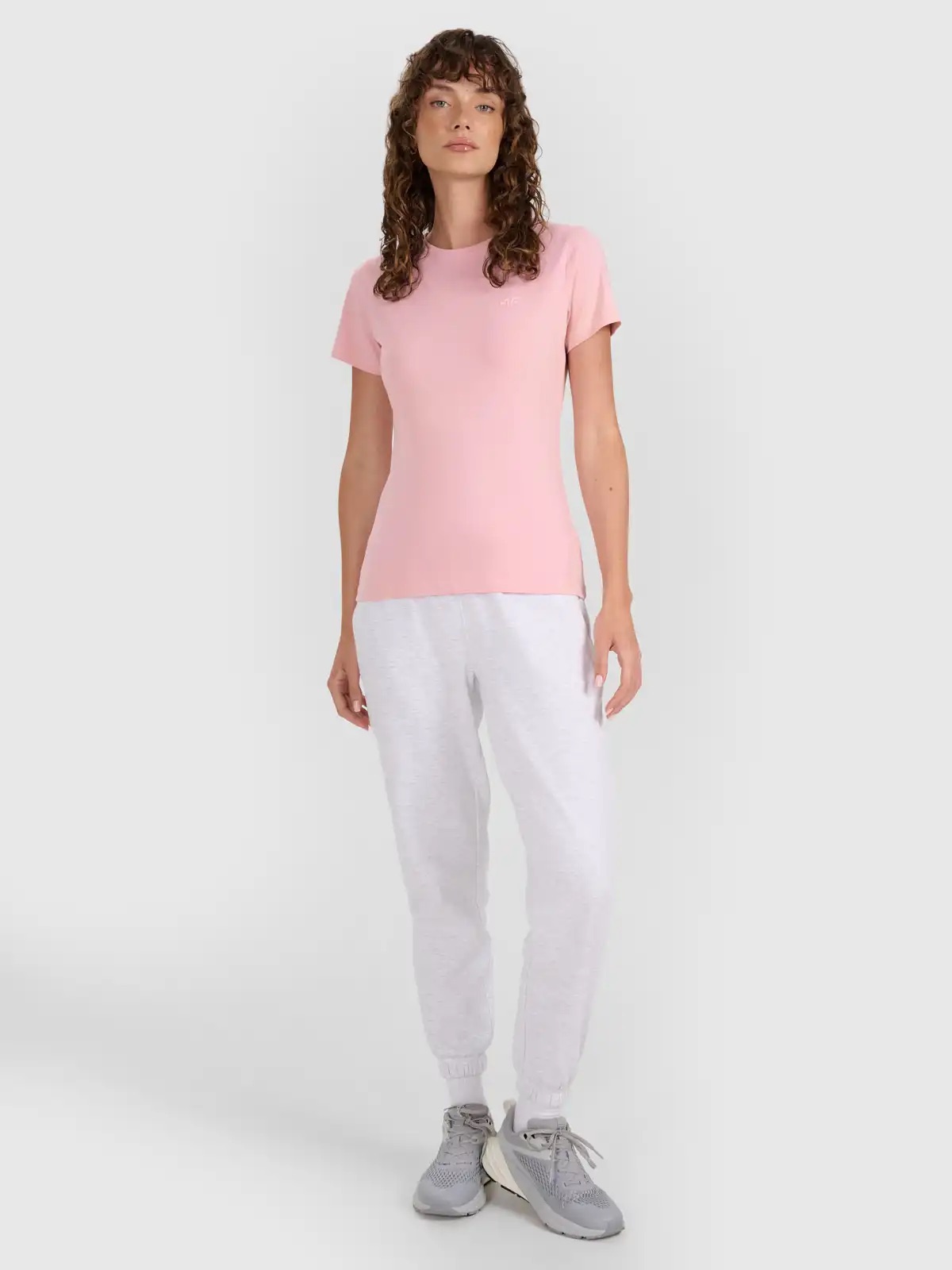 The women's plain t-shirt with short sleeves is made of 95% cotton, making it soft, durable and pleasant to the touch. Thanks to the addition of elastane (5%), it is stretchable and fits comfortably on the figure. The round neckline is finished with light rib.