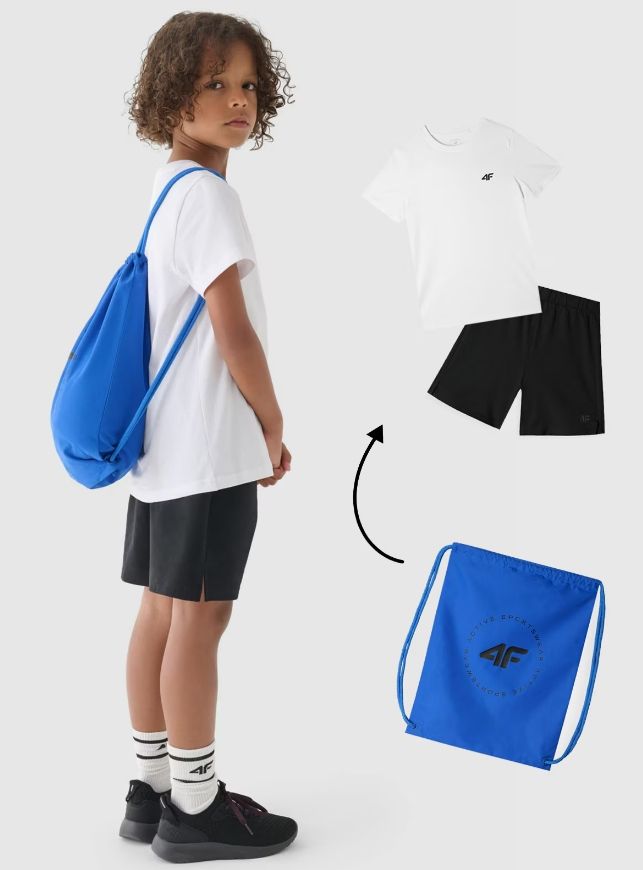 Zēnu sporta komplekts fizkultūrai (t-krekls + šorti + maiss) sastāv no ērta t-krekla, šortiem un maisa sporta apģērbam un aksesuāriem. Lieliski piemērots dažādām sporta aktivitātēm, piemēram, fizkultūrai.
