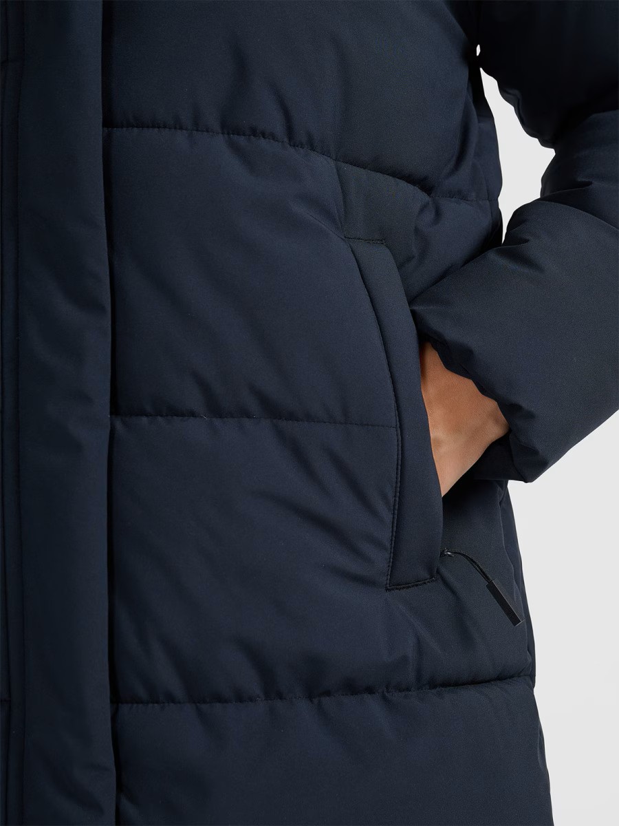 Ūdeni atgrūdošais pārklājums pasargā audumu no ūdens uzsūkšanās, savukārt poliestera sildāmmateriāls nodrošina siltumu bez lieka svara un ir viegli kopjams.