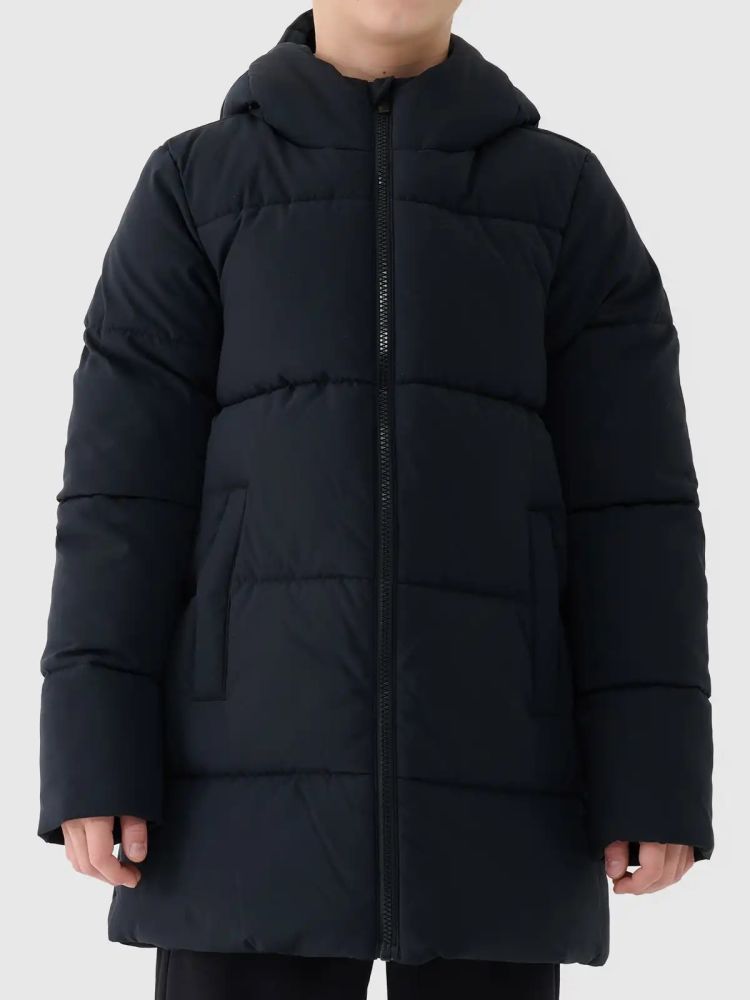 Пуховик для мальчика с синтепоном. Изготовлен из широкой стеганой ткани с наполнителем из синтетического пуха.