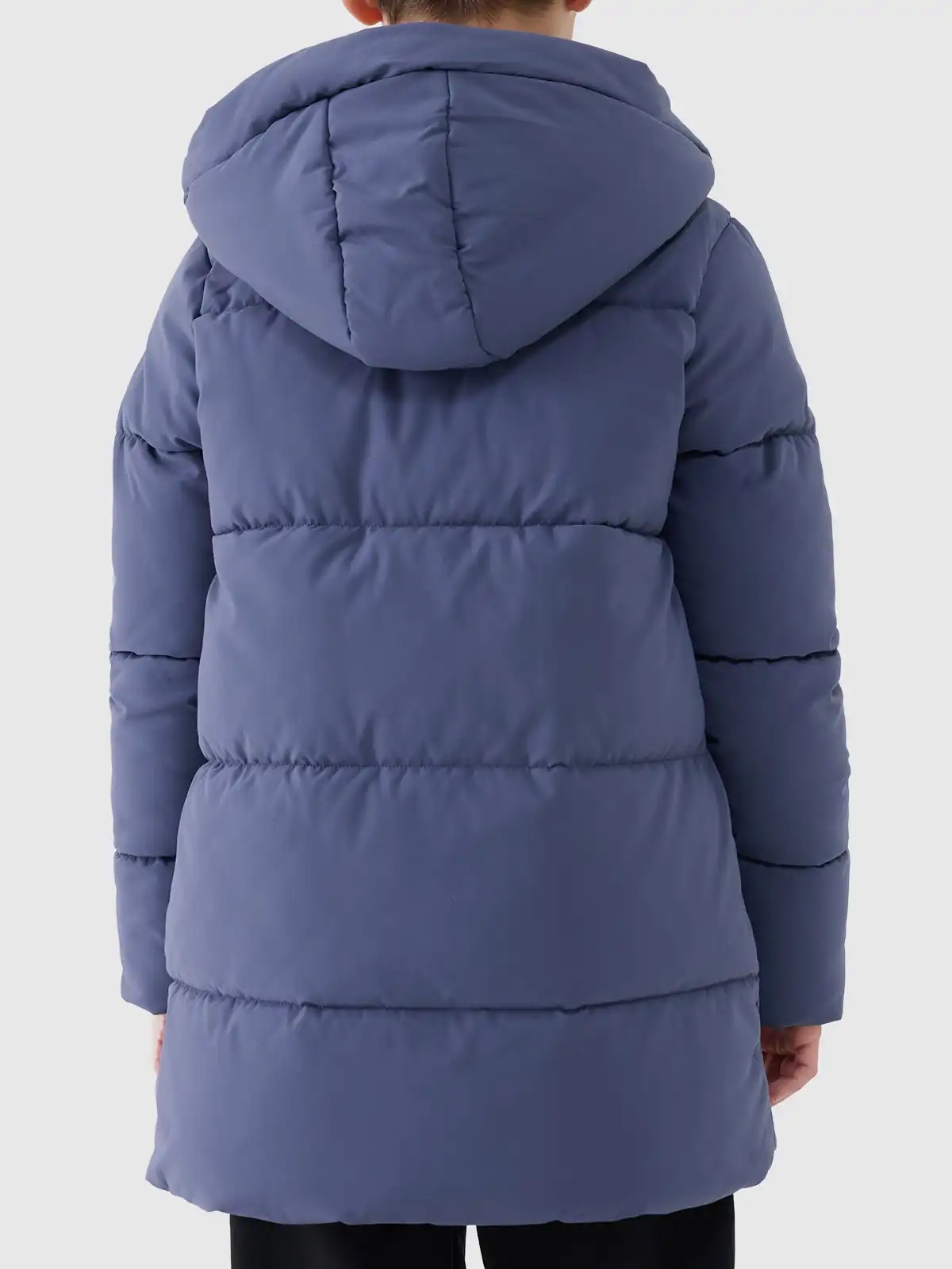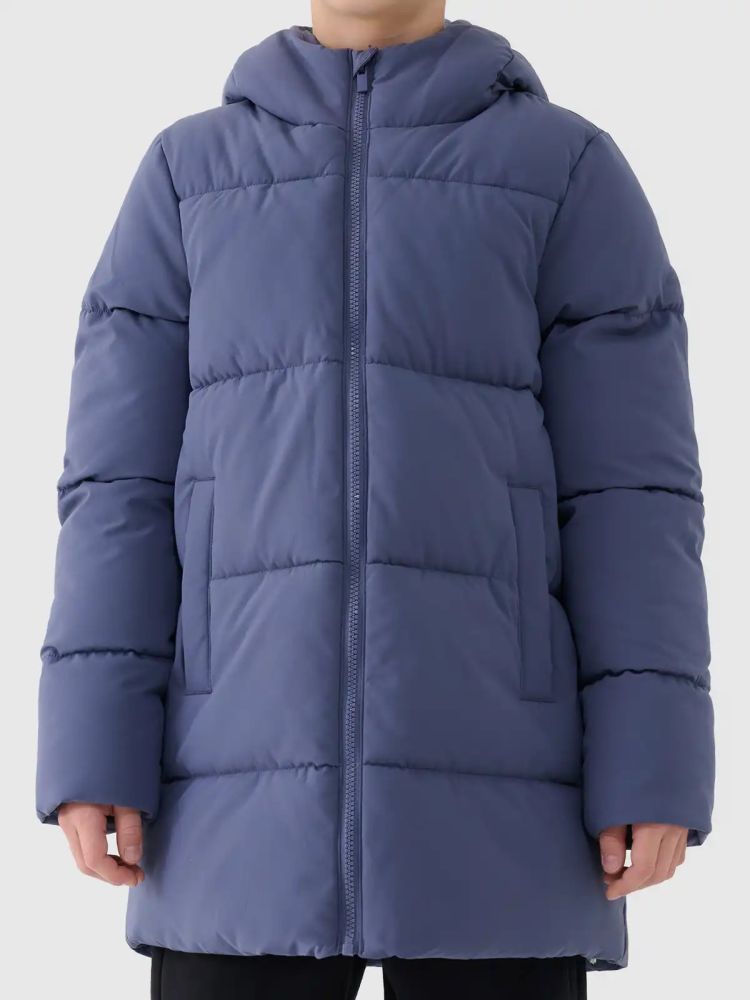 Пуховик для мальчика с синтепоном. Изготовлен из широкой стеганой ткани с наполнителем из синтетического пуха.